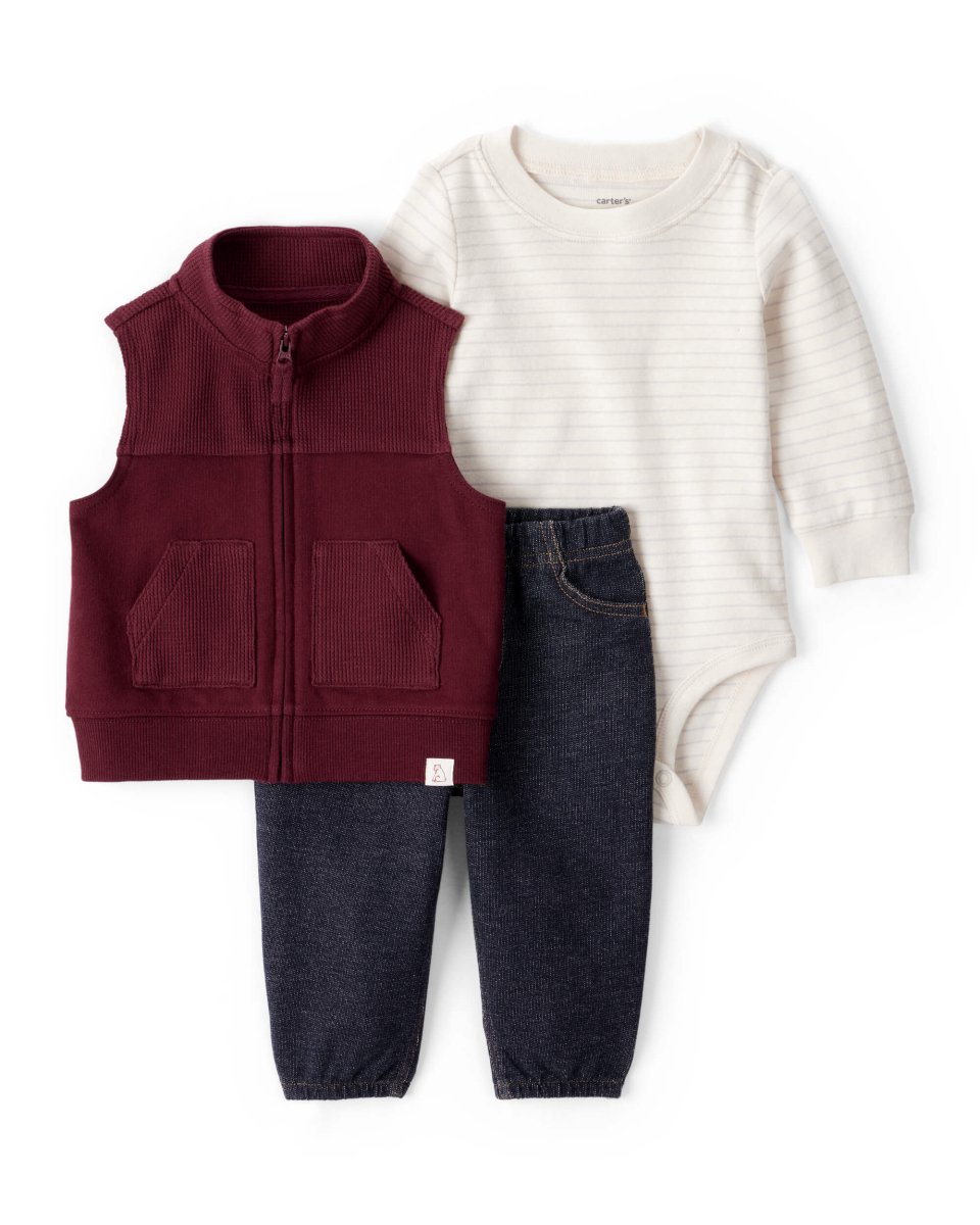 Este conjunto de 3 peças da Baby B'gosh combina estilo e praticidade para o dia a dia do seu pequenote. Inclui um body de manga comprida, um colete com fecho e umas calças de ganga com cós elástico, oferecendo um look completo e confortável.