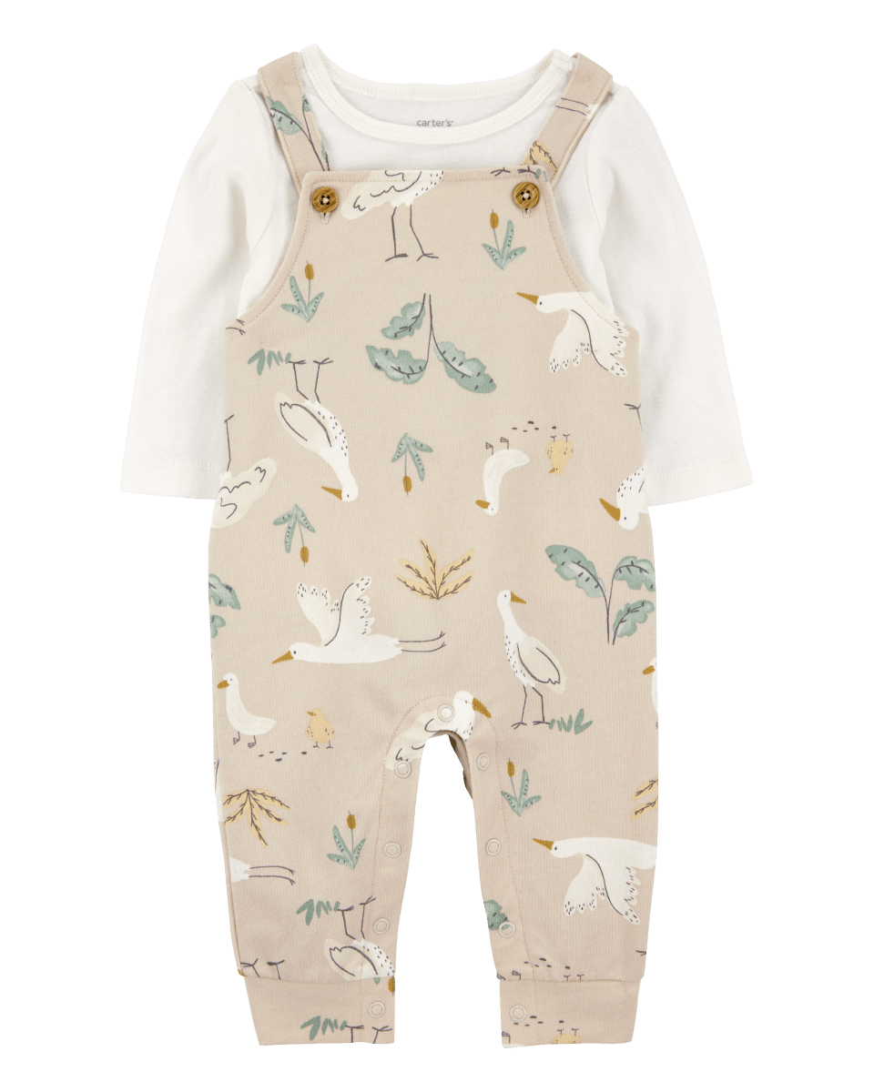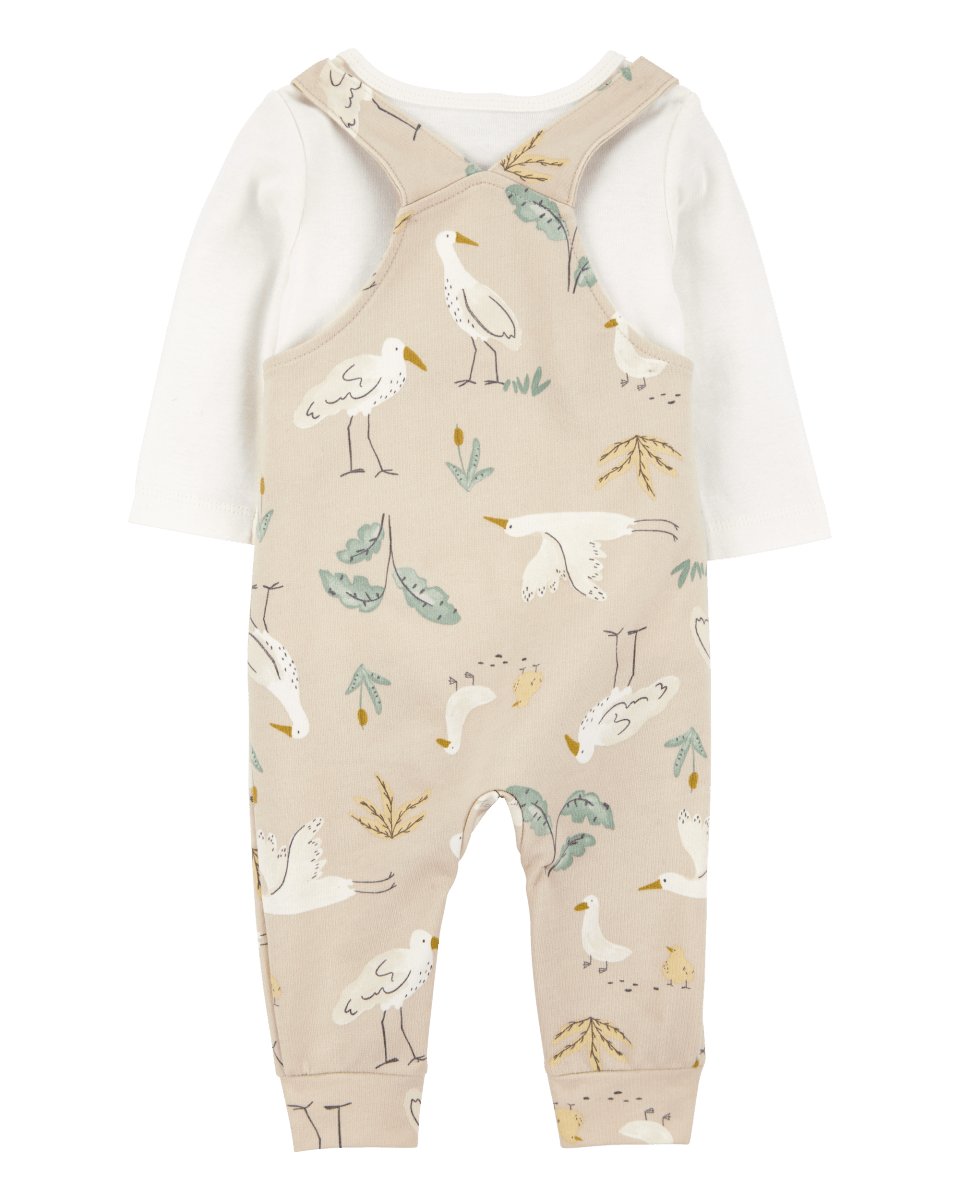 Conjunto de duas peças de macacão de algodão e camiseta com estampa de cegonha