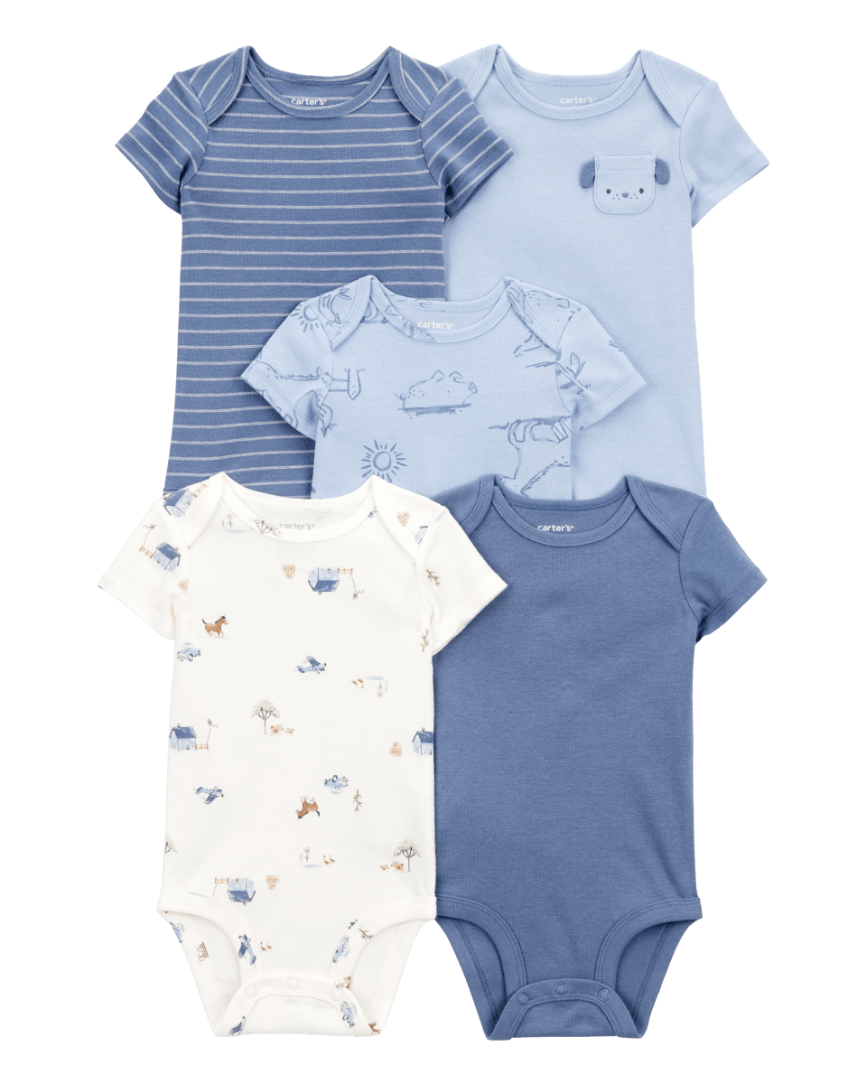 Garanta o conforto do seu bebê com este conjunto de cinco bodies de algodão de manga curta. Projetados para o dia a dia, eles têm ombros sobrepostos para facilitar a troca e botões reforçados no gancho para maior praticidade. Macios, respiráveis ​​e resistentes à lavagem, são ideais para qualquer ocasião. Um item essencial no guarda-roupa do seu pequeno!