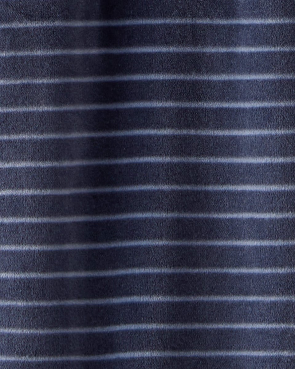 Conjunto de dos piezas para bebé que incluye sudadera de felpa azul con bolsillo frontal decorado con carita de oso y orejas 3D, y pantalón jogger a rayas. Su ajuste cómodo y tejidos suaves lo hacen ideal para el uso diario, ofreciendo calidez y libertad de movimiento.