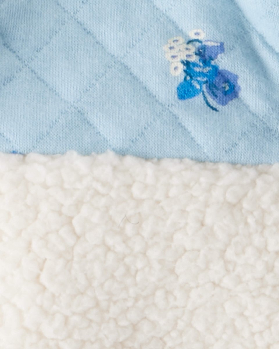 Conjunto de tres piezas para bebé que incluye chaqueta de borreguito con cremallera y cuello, body de manga corta y pantalón floral. La chaqueta con detalle acolchado ofrece abrigo adicional, mientras que el pantalón con cintura elástica y el body de algodón suave aseguran comodidad durante todo el día.