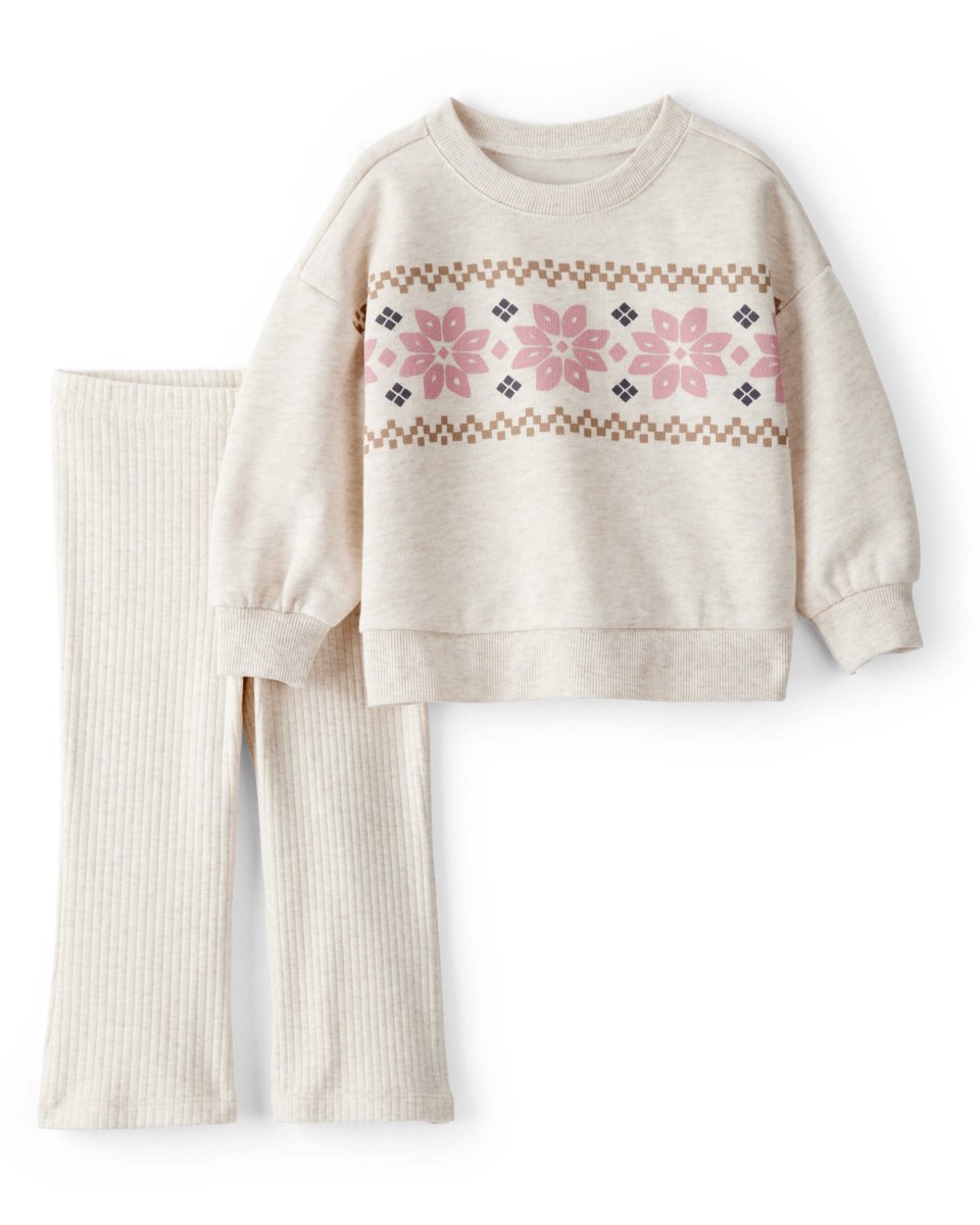 Conjunto para bebé com sweatshirt com estampado Fair Isle e calças a condizer. Fabricado com tecidos macios e elásticos para conforto durante todo o dia, ideal para climas frios e uso diário.