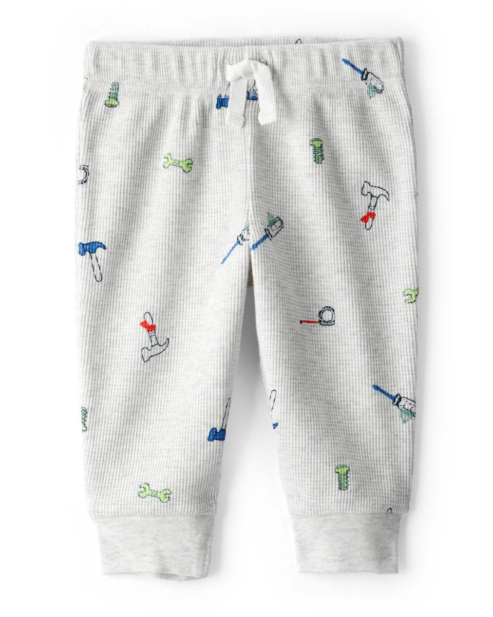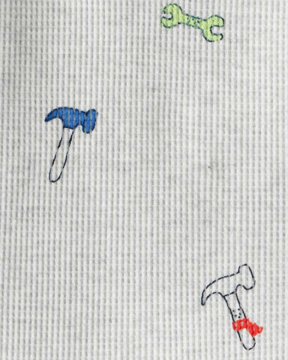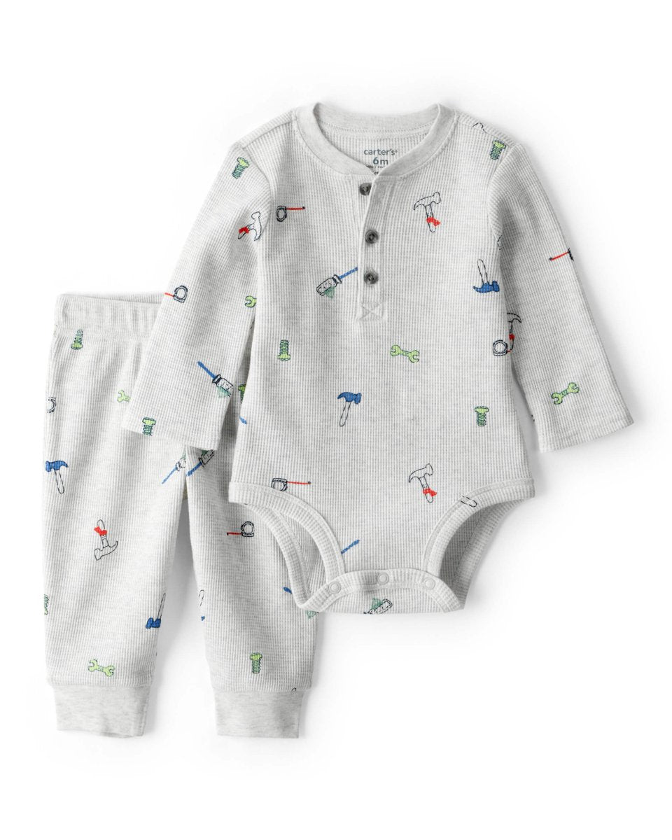 Conjunto de duas peças para bebé, composto por um body térmico de manga comprida com estampado de ferramentas e calças jogger a condizer. Fabricado em tecido macio tipo waffle para conforto e aquecimento durante todo o dia. O cós elástico e os punhos ajustados das calças facilitam a muda da fralda e a troca de roupa.