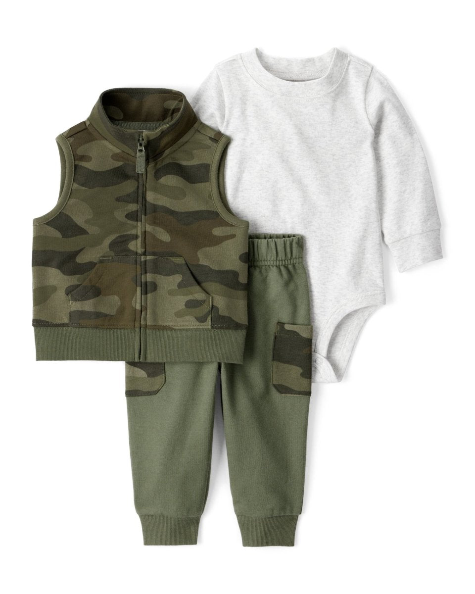 Conjunto de 3 peças com colete camuflado e calças jogger
