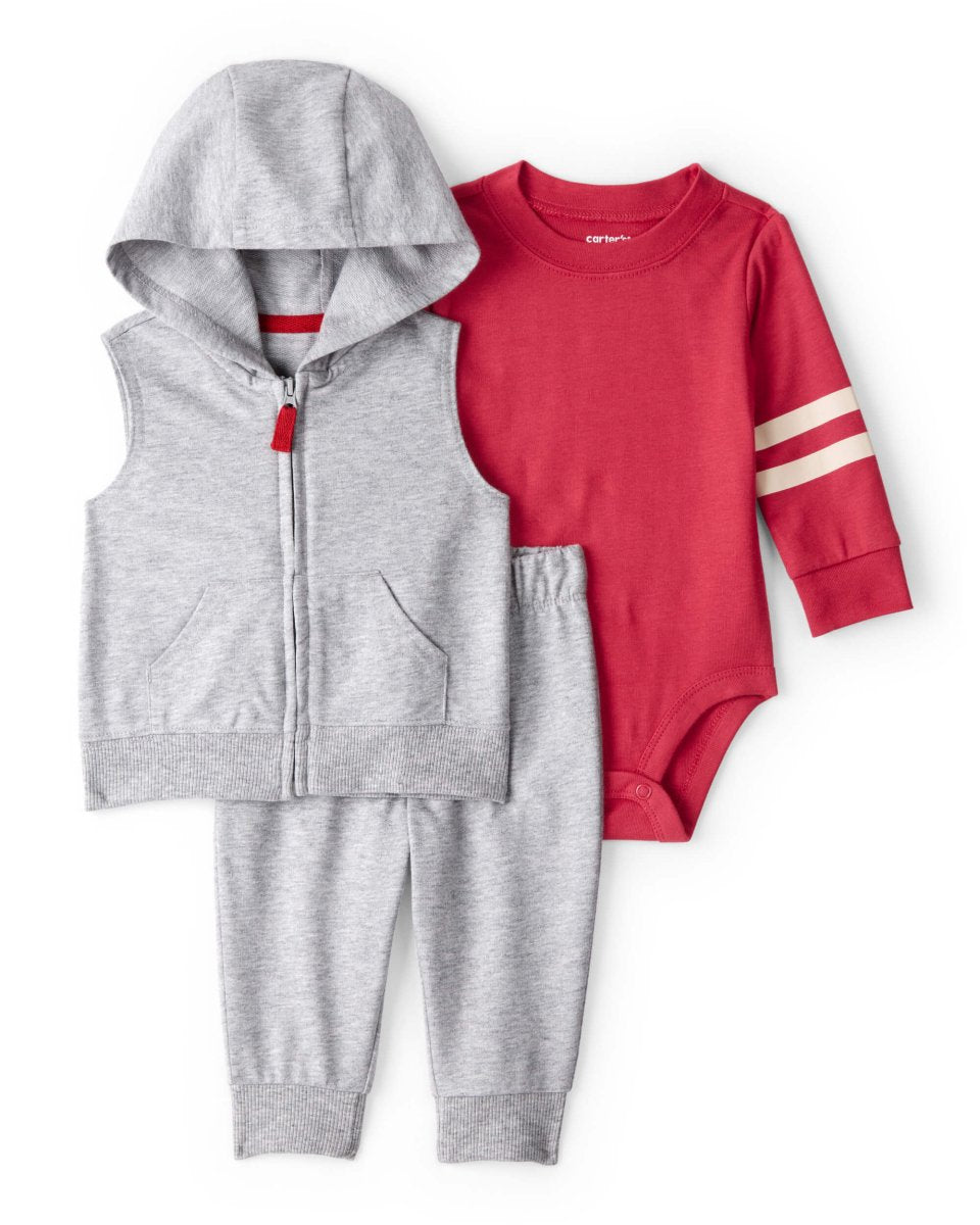 Este conjunto de 3 peças em tons de cinzento destaca-se pelo seu estilo moderno e minimalista. A sua paleta neutra facilita a combinação com qualquer outra peça de roupa, oferecendo um look suave e equilibrado para o dia a dia do bebé.