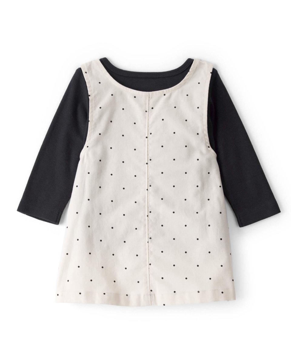Conjunto de três peças para menina, composto por um vestido sem mangas com bolsos em forma de coração e estampado de bolinhas, uma blusa de manga comprida e collants a condizer. O vestido evasé oferece conforto e liberdade de movimentos, enquanto a blusa e os collants completam um look pronto para qualquer ocasião.