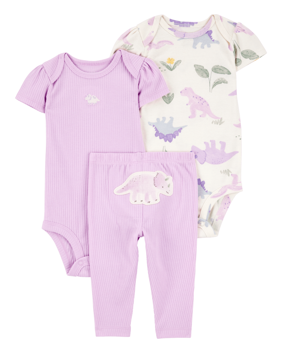 Este conjunto com tema de dinossauro reúne tudo o que seu bebê precisa, perfeito para presentear ou renovar o guarda-roupa. O conjunto inclui dois bodies de manga curta com ombros expansíveis para fácil acesso por cima da cabeça e calças combinando, todos em algodão macio para conforto o dia todo. Perfeito para manter seu bebê confortável e estiloso.