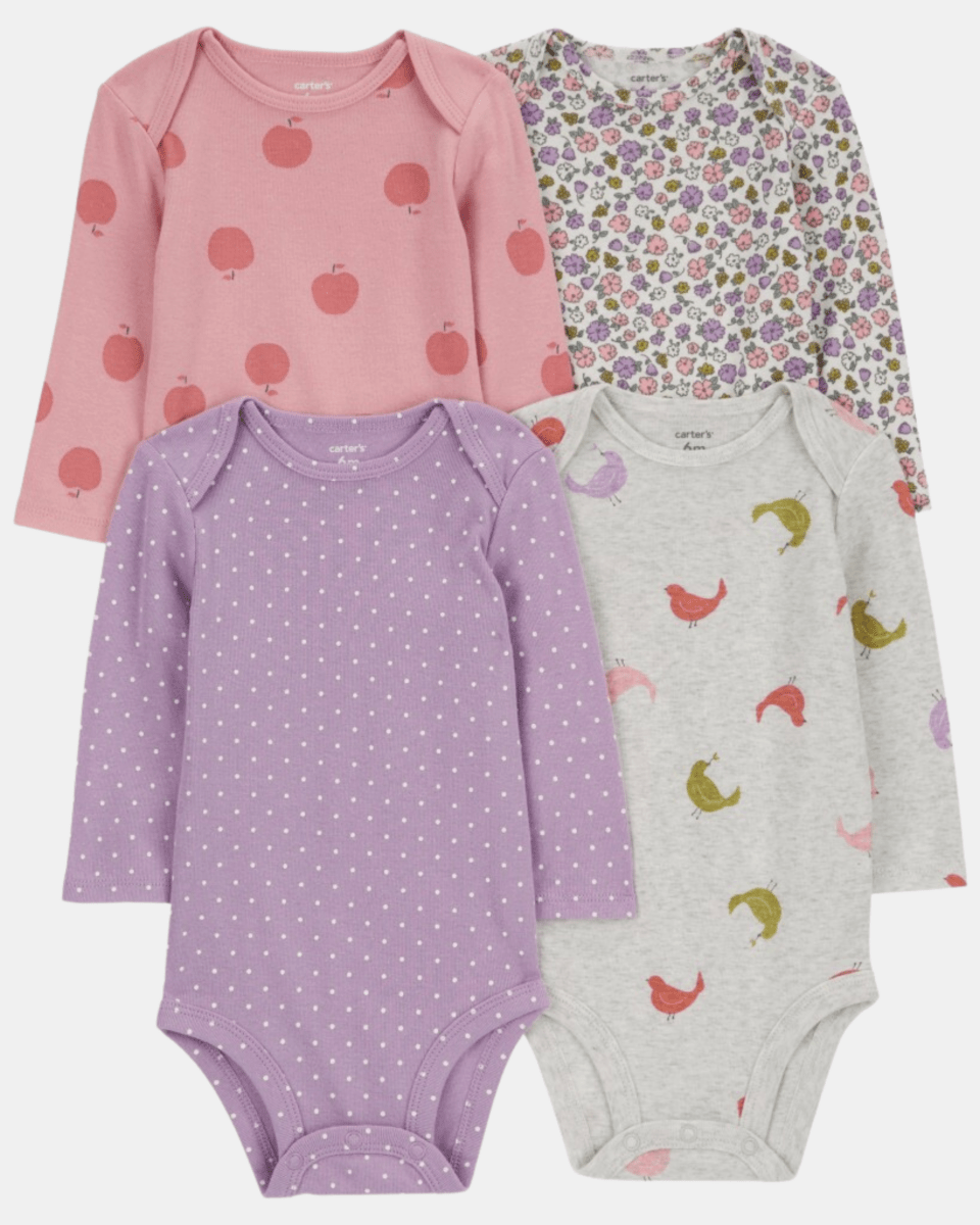 Prepare o guarda-roupa do seu bebê com este pacote de quatro bodies de manga comprida, perfeitos para mantê-lo confortável o dia todo. Projetado com ombros abaulados para facilitar ao vestir e botões de pressão resistentes nas pernas para troca rápida e fácil.