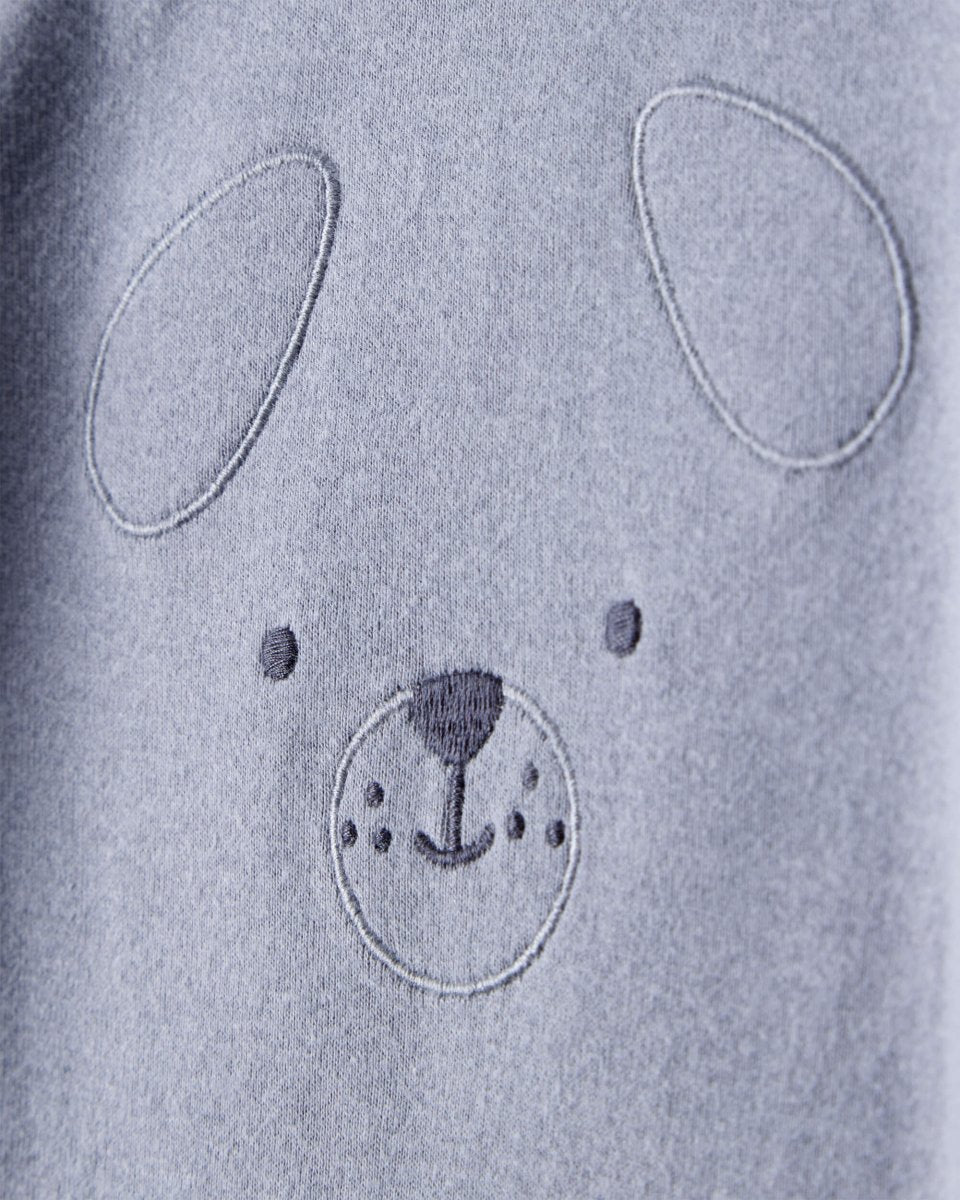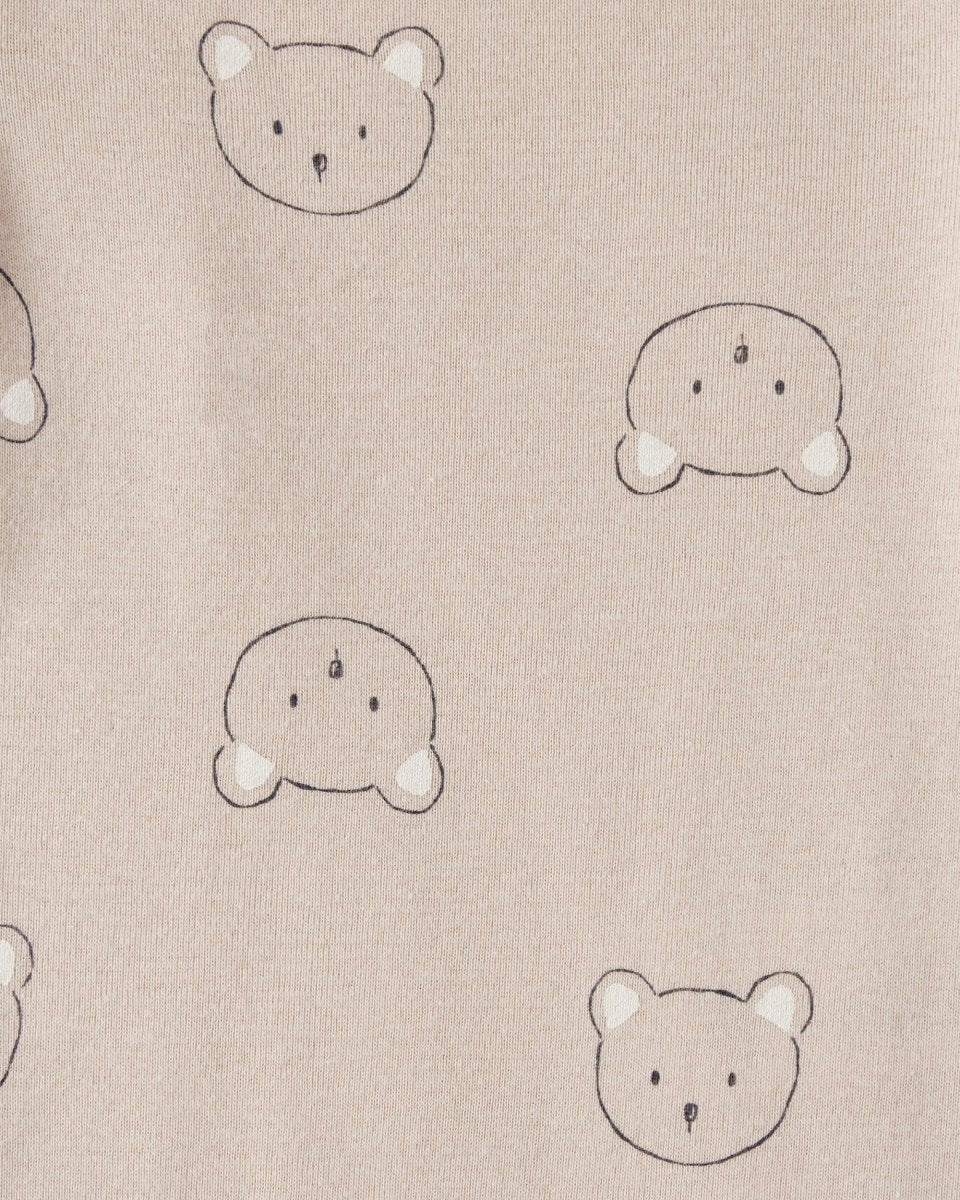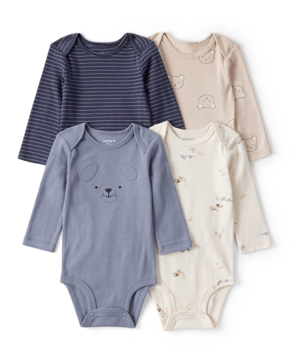 Pack de quatro bodies de manga comprida para bebé menino com estampados de ursos em tons neutros. Feitos em algodão macio para conforto durante todo o dia. Inclui fechos de encaixe no gancho para facilitar a troca de fraldas.