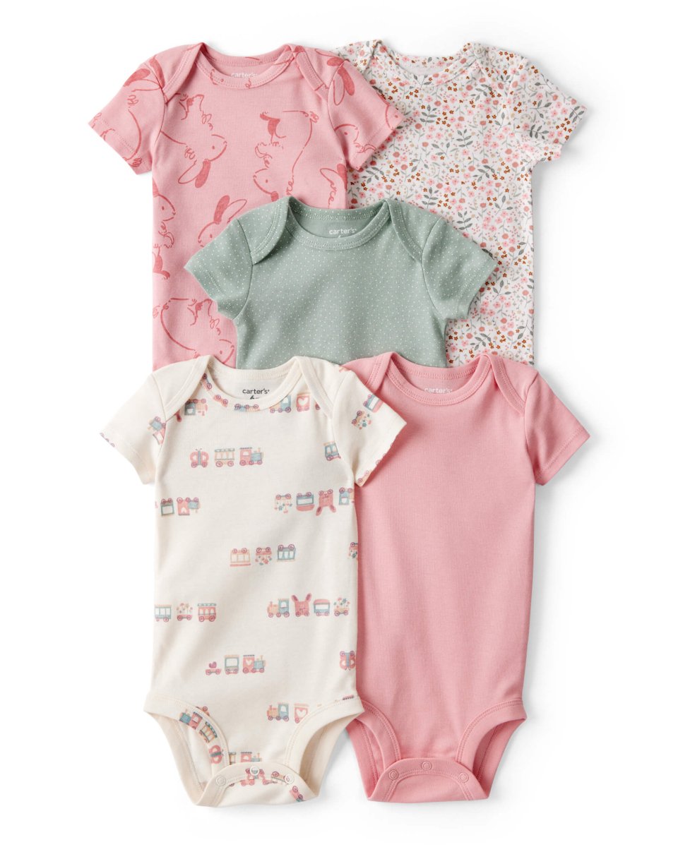 Pack de cinco bodies de manga curta para bebé em diversos modelos, incluindo caudas, coelhinhos, flores e cores sólidas. Confecionados em algodão macio e elástico para conforto durante todo o dia, são ideais para usar sozinho em dias quentes ou como camada base em dias frios. Possuem ombros sobrepostos e fechos de encaixe no entrepernas para facilitar a muda da fralda e a muda da fralda.