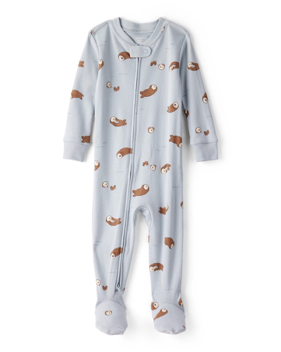 • Pijama de uma só peça em tons de azul.